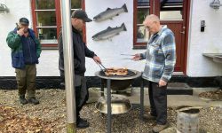 Formiddagen var præget af en del regnvejr. Og med de seneste dages nedbør, var vandstanden steget en del, så der var flere steder der var behov for lange støvler. Selv om det føltes lidt råkoldt ude ved åen, fik vi hurtigt varmen i laden, da der blev tændt op for varmen i oliekaminen. Henning havde haft kontakt med en meget stor laks på flue i Gelså. Det kunne nemt have været en ny personlig rekord. Men den slog sig hurtigt løs. Dres fangede en laks på godt 60 cm i Gelså, men den blev nænsomt genudsat. Som sædvanlig gik snakken…